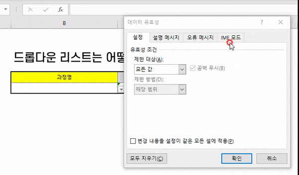엑셀 드롭다운(목록박스) 메뉴 만들기 #1 - 목록 직접 기입