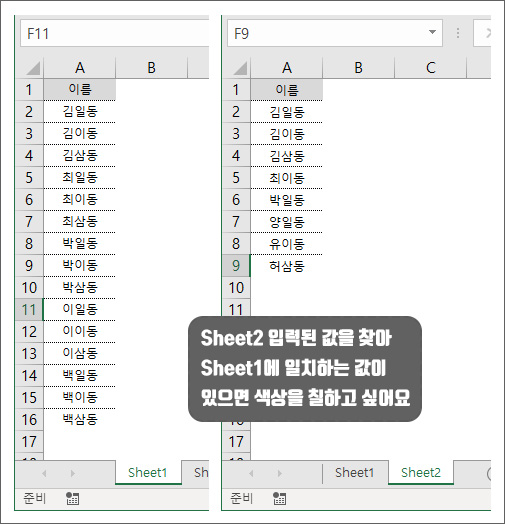Q. Sheet 2에 입력된 정보가 Sheet 1에 정보와 매칭된다면 셀에 색상을 칠할 수 있나요? (아래 그림)