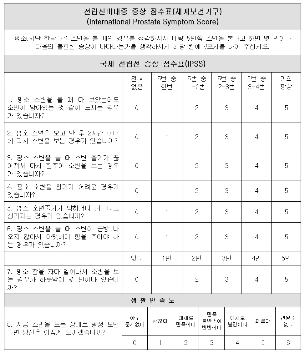 전립선비대증으로 인한 증상을 점수화해 전립선비대증의 심한 정도를 쉽게 확인할 수 있는 '국제전립선증상점수'가 있습니다.