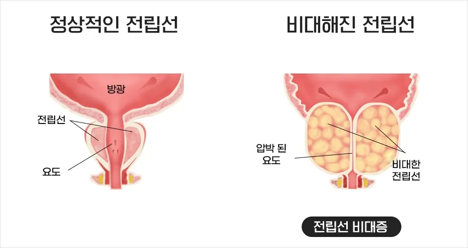 전립선비대증은 요도 주위의 전립선이 비정상적으로 커져 소변의 배출을 막고 배뇨에 불편함 증상이 발생하는 일반적으로 신체 노화로 발생하는 전립선 질환입니다.