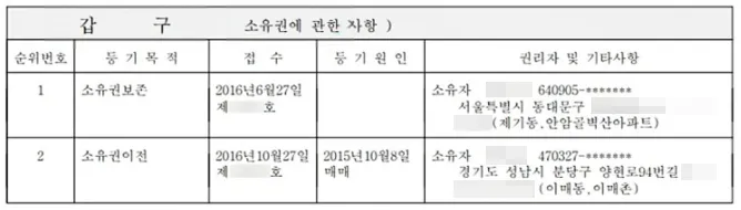 갑구는 소유권에 관한 사항으로 쉽게 말해 '누가 이 집을 소유'하고 있는지 즉, 집주인이 누구인지 볼 수 있습니다.