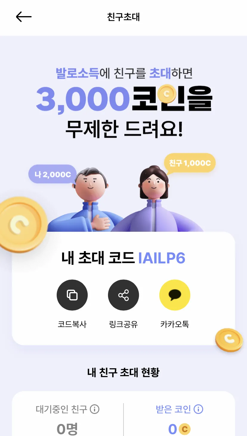 - 발로소득 앱 실행 후 하단의 전체 메뉴를 터치 후 친구초대를 터치하세요