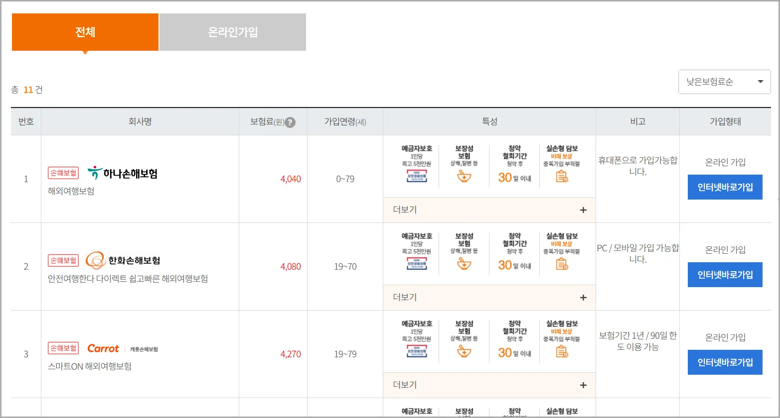 여행자 보험 회사별로 보험료와 특성의 정보가 바로 나오고, 가입도 빠르게 진행이 가능합니다.