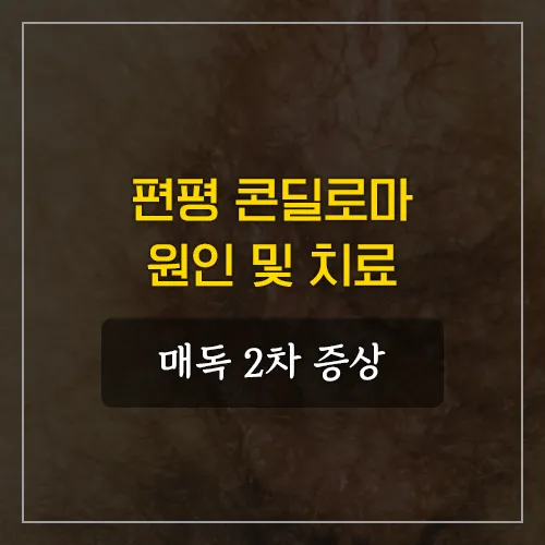 편평 콘딜로마는 매독 2차 증상 중 하나로 매독균에 의한 성병인 매독의 양성 피부 증상을 말합니다. 일반적으로 생식기 주변이나 입 주변, 항문과 같이 습한 부위에 많이 발생합니다. 매독 1차 증상인 피부 병변 이후 2~8주 후에 시작되어 발진이 나타나는 것이 특징입니다.