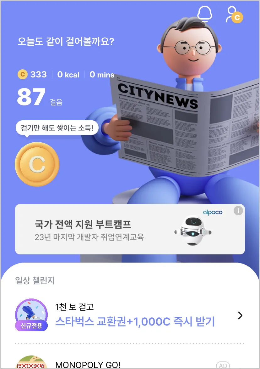 단순하게 걸으면 걸음 수에 대비하여 포인트가 쌓이는데, 누적한 포인트로 식품이나 영화 예매권, 상품권을 교환할 수 있는 앱입니다. 걷기 운동을 하고 대가로 포인트가 쌓여 동기부여가 되니 한번 이용해 보세요. (무료 앱입니다.)