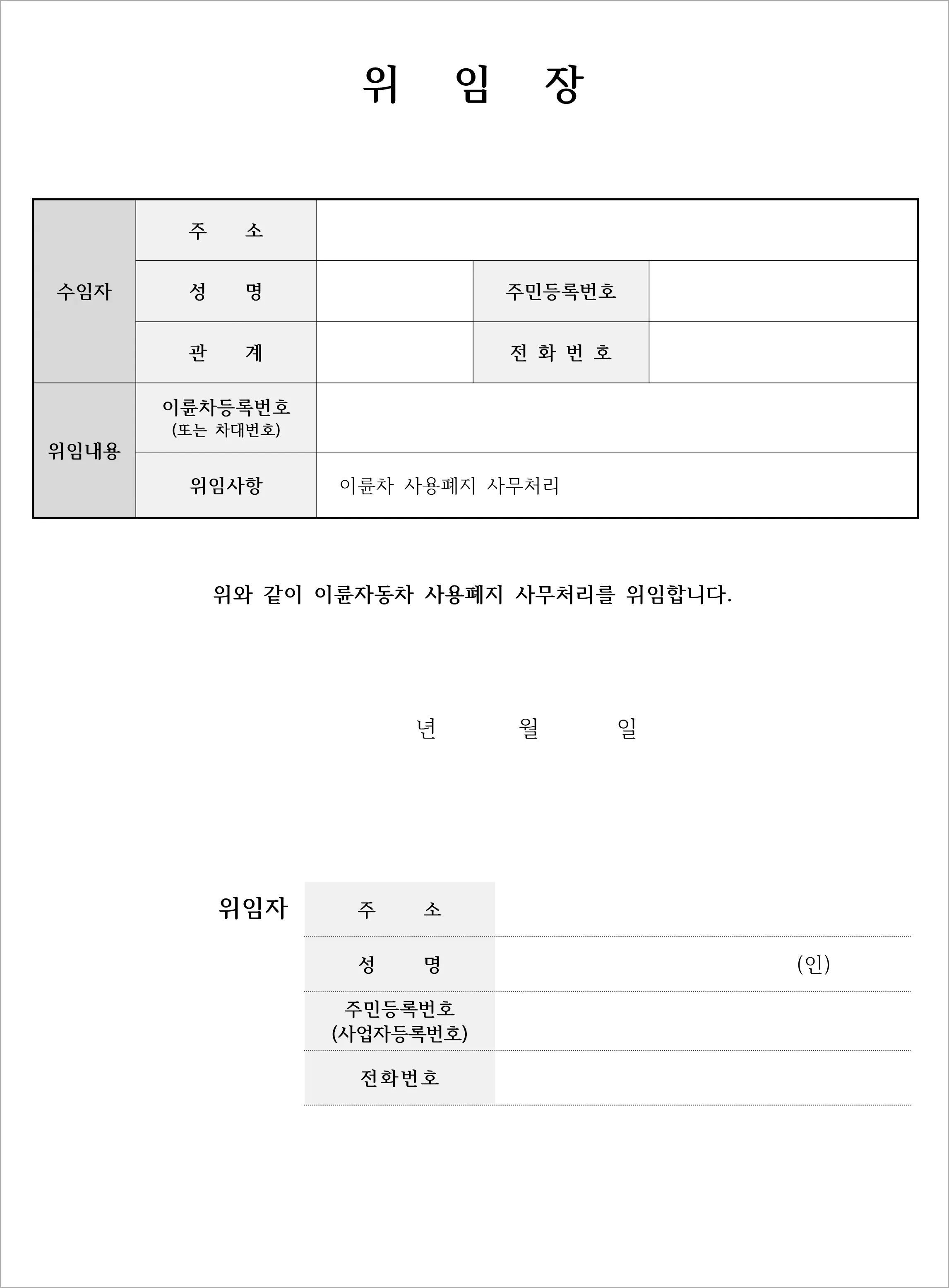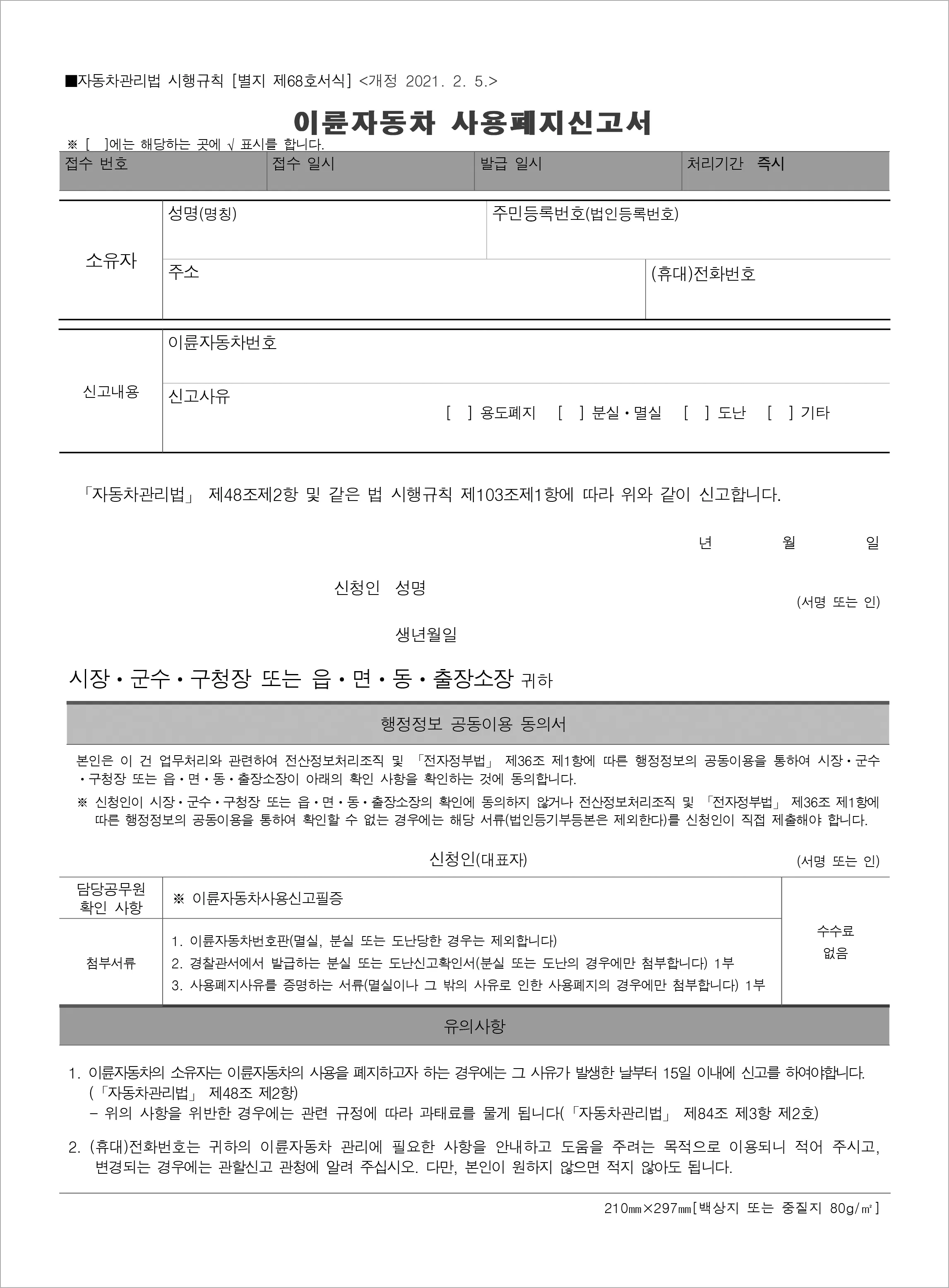 이륜차 사용폐지 신청서와 위임장은 아래에서 다운로드하실 수 있습니다.