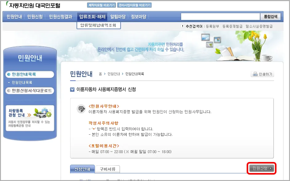 만약 이륜자동차 사용폐지증명서를 분실했다면 자동차민원 대국민포털 홈페이지에서 온라인으로 발급이 가능합니다.