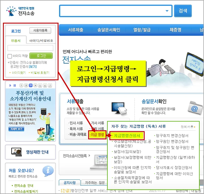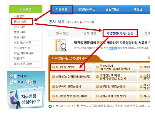 - 위와 같이 로그인 후 지급명령 신청서 메뉴를 클릭합니다.