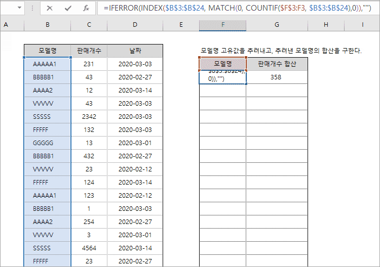 2. 추려낸 고유한 값의 모델명을 기준삼아 판매개수를 SUMIF 로 합산한다.