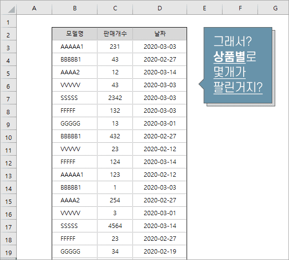 동일한 상품의 판매수량을 기록한 데이터가 있다고 가정해보고, 상품별 총 몇개가 팔렸는지 합산을 해보는 방법입니다.