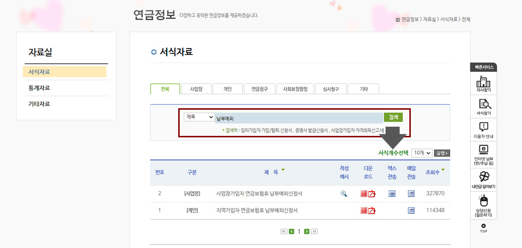 검색 결과에 신청하시고자 하는 유형(사업자 or 개인)에 따라 제공되는 한글 (HWP) 파일과 PDF 파일을 다운로드하여 국민연금 납부예외 신청서에 내용을 기입 후 팩스 발송으로 신청을 할 수 있습니다.