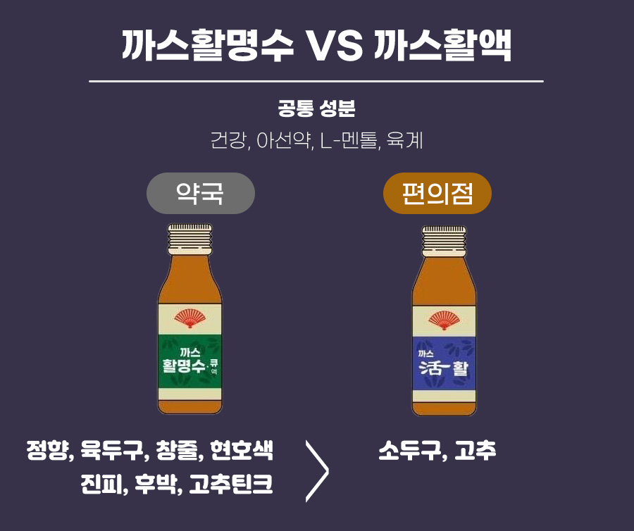 물론 약국에서 판매하는 '까스활명수'가 공통 성분외에 추가 된 성분이 훨씬 많이 들어가 소화 효능이 더욱 좋답니다.