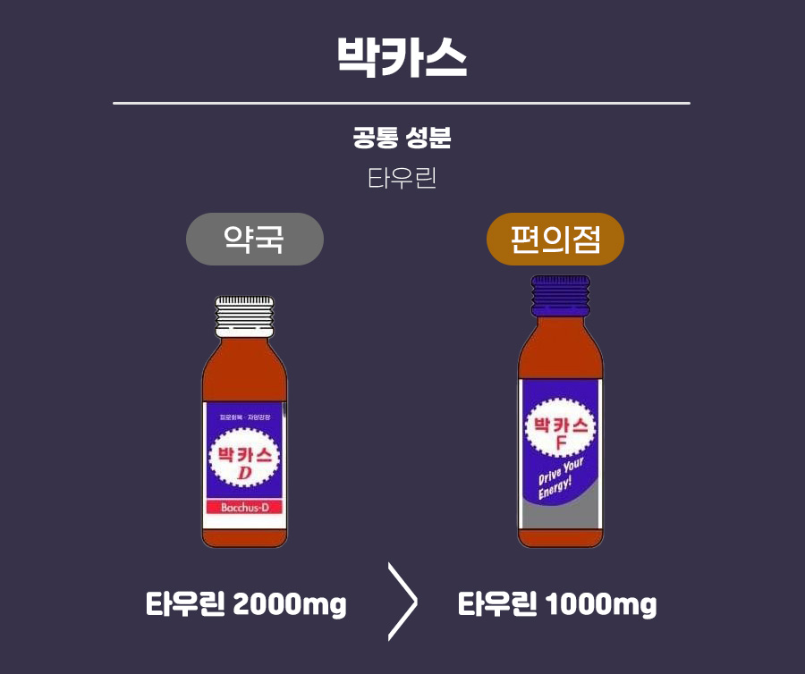 그리고 이름도 살짝 차이가 있는데요. 약국은 '박카스 F' 편의점은 '박카스 D'라는 이름으로 판매됩니다. 또한 피로 회복을 돕는 타우린이 약국에서 판매하는 박카스에는 2000mg이! 편의점에서 판매하는 박카스는 그 절반인 1000mg이 들어가 있답니다.