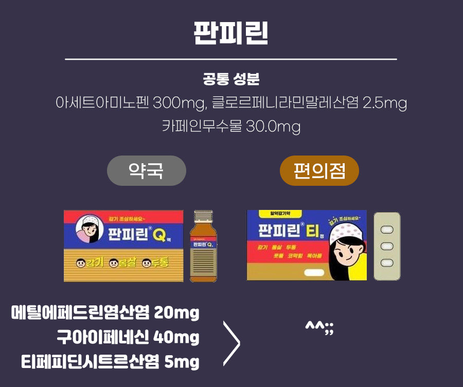 기본적으로 약국과 편의점에서 판매하는 '판피린'은 콧물, 알레르기, 해열 진통을 개선하는 3가지의 성분은 같습니다. 하지만 약국에서 판매하는 '판피린 Q'는 기관지, 기침, 가래까지 개선해 주는 성분이 더 추가되어 있는 의약품이랍니다.