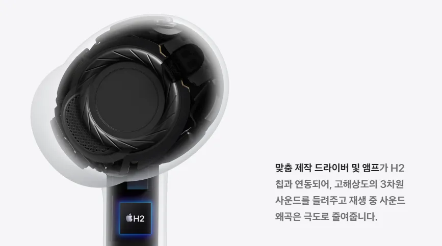 H2칩이 그대로 유지되며 공간 오디오(Spatial Audio) 성능이 더욱 정교해졌습니다. 특히 머리 위치를 기준으로 음향을 조정하는 3차원 오디오 기능이 자연스러워졌죠.