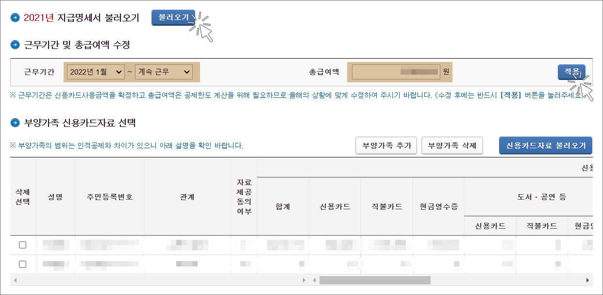 2. 총 급여액과 인적 공제 항목을 추가한 다음 '신용카드자료 불러오기'를 클릭
