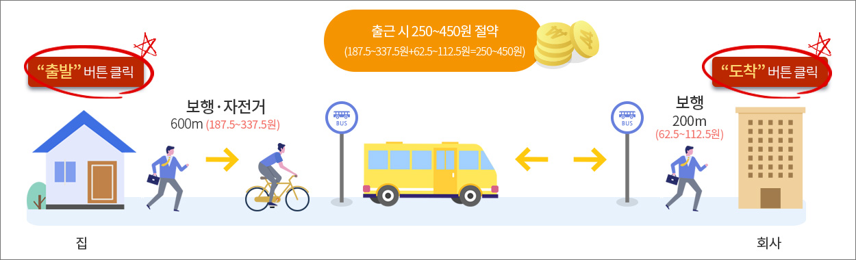• 대중교통 이용과 연계한 보행/자전거 이용거리에 대한 마일리지 최대 800m까지 250원 적립(1회 한도 250원/1일 횟수한도 없음), 최대 20% 할인(月 11,000원/44회 한도)