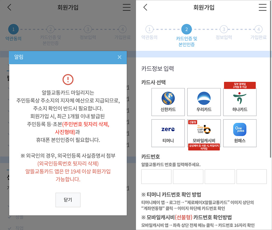 2. 모바일캐시비와 원패스는 알뜰교통카드 앱 회원가입 시 모바일캐시비 선불형 카드번호, 원패스 카드번호를 등록하면 연동됩니다.